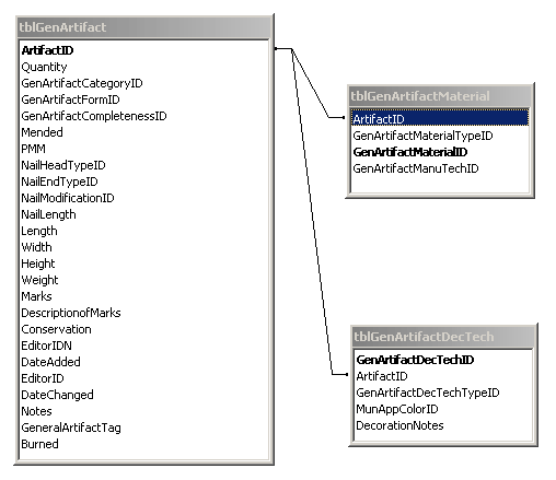 This table contains all artifacts not recorded in the special artifact tables. Ceramic vessels, glass vessels, beads, buttons, buckle, tobacco pipes or utensils are not cataloged in this table.