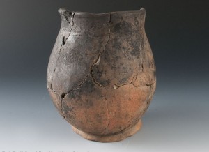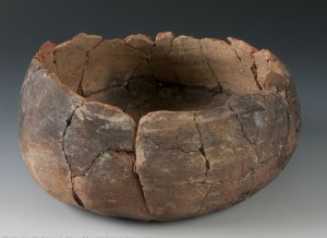 Bowls and jars are by far the most common colonoware vessel forms on South Carolina plantation sites. Jars were ostensibly used to heat liquids and cook stews and the like. This is an interior view of a flat-based jar from Curriboo plantation in South Carolina. Pots like this with flat (not rounded) bases are absent from the archaeological record at pre-European contact sites. Before their implementation, vessels would have been suspended or supported by stones over an open fire during cooking. Flat bases allow the pots to sit flat on European-style hearths and tables. Note the sooting present on the exterior of this jar, a result of its life as a cooking pot.