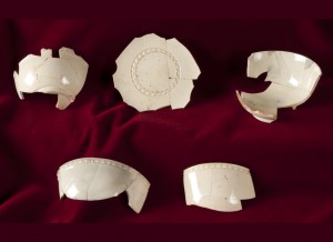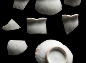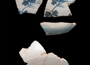 These sherds represent just a few of the numerous an hua mustard jar sherds found in the West Kitchen Yard area. Each vessel has faint molded artichoke-style decoration, a classic an hua design. An hua referes to the subtle decoration that was incised on the body of the vessel prior to firing; an hua decoration is often only noticed when light catches on the vessel.