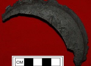 This cast iron fragment is part of a lid to a cast iron cooking vessel. Found in the Dry Well, it is one example of the kitchen-related artifacts found within a deposit of kitchen refuse. Other kitchen-related artifacts included charred seeds and fruit pits, animal bone fragments, utilitarian food storage vessels, milk pans, and large iron cooking implements.