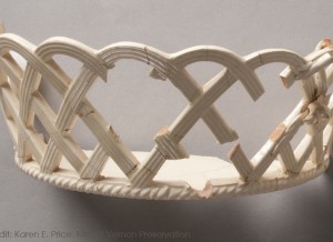 This creamware serving vessel was likely used as a fruit basket. Constructed of intricately woven molded spokes to evoke the impression of basketry, this costly vessel was likely prominently displayed on dining or parlor tables and sideboards when in fashion. Handles on each side of the basket are also ribbed and twisted . Sprig-molded leaves and flowers mask where the handles attach to the body of the basket.