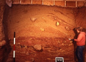 While excavating the Dry Well, excavators left a small portion of the feature intact and unexcavated. This photograph was taken at the end of the Dry Well excavations, viewing the unexcavated portion of the Well in profile. As one can see, the Dry Well was filled with layer upon layer of sediment. One can envision each of the thin layers visible in the profile as being deposited from different wheel barrows or shovels.