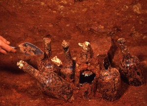 Partially-excavated wine bottles at the bottom of the Dry Well