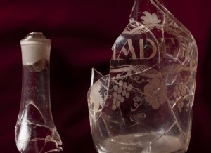 This vessel was excavated from several Dry Well deposits and was thus likely discarded in the late 1770s. Other leaded glass drinking vessels, including numerous stemware fragments, were also found in the Dry Well feature and are featured elsewhere in this gallery. The neck mends to the rest of the body, but the area that attaches the two segments is too small to attach them together and thus is photographed with the two sections adjacent to one another.