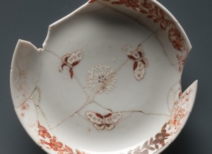 Found in the Dry Well, this Chinese export porcelain saucer includes an elaborate botanical band around the interior rim and an intricate depiction of three moths around a white flower on the center of the base. All of the decoration was executed in hand-painted over-glazed enamel, meaning that it was applied after the vessel was fired. While the red and white paints are easily visible, if one looks closely faint remnants of gilt decoration used on the botanical band can also be seen. The pattern name remains unknown.
