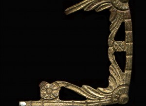 Found in an upper level of the Dry Well, this fragment of a shoe buckle frame is cast in copper alloy. Conservation in the 1980s restored its original brass-colored appearance. On two parts of the frame, seen on the broken edges of this fragment, there are remnants of silver-colored solder that may indicate an attempt to repair the broken frame for continued use. Open work, intricate designs, and delicate appearances such as this were common on Colonial period shoe buckles, indicating the decorative as well as functional use of these accessories.