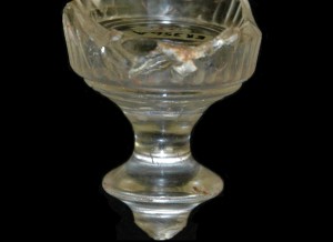 A wide variety of glass vessel and forms, including wine bottles, pharmaceutical bottles, drinking glasses, tumblers, and stemwares, were found during excavations at the West Kitchen Yard. This small cordial or aperitif glass is an example of one of those stemwares found during excavation. Made of leaded glass and decorated with cut flutes and hand-formed bladed knops1, this stemware was likely manufactured in England and imported to the Colonies. Other decorated leaded glass fragments found in the Dry Well included enamel and air twist stemware stems, etched glass, and additional cut or ground decoration.