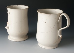 Found in the Dry Well, these two finely potted mugs are believed to be examples of chocolate mugs manufactured between c.1750-1760 in Staffordshire England.1 Fragments of a third mug, much more fragmentary and only partially reconstructed after excavation, were also found during the Dry Well excavations. Portions of these mugs were reconstructed in the 1980s using a plaster-like substance, which can be differentiated from the original white salt glaze sherds by its matte appearance.