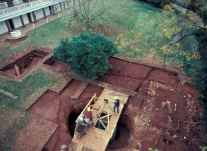 This photograph is an overhead view of the West Kitchen Yard excavations, facing northeast. Taken near the end of excavations, the Dry Well is in the foreground, the MRS-1 (F11) stone foundation is to the south, and the ditch (F05) is to the north. The South Dependency wing of the Monticello mansion is visible in the background. Under the direction of Dr. William Kelso, this block excavation included over 45 excavation units, over 350 individual archaeological contexts, and recovered more than 100,000 artifacts over the course of three field seasons from 1979 to 1981.