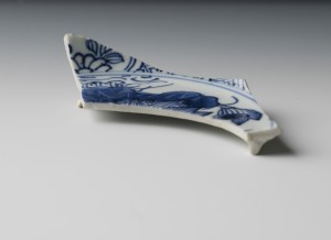 This base fragment of a Chinese Porcelain saucer exhibits a finely handpainted scene with botanical elements on the interior surface and adjacent botanical and trellis band designs circling the interior of the body. Seventeenth-century Port Royal may have been a wicked place, but merchants and other individuals also used their new-found wealth to display genteel qualities. Brown1 has suggested that the merchants of Port Royal gathered in taverns to socialize and display their developing gentility as a means to signal their high status. Using high-end Chinese Porcelain teawares would have allowed tavern visitors to take part in the tea ritual and enjoy drinks other than alcohol while showing off their status.
