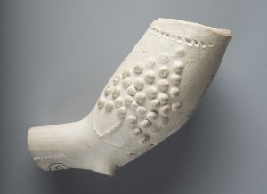 Pipe smoking was another popular recreational past time enjoyed by New Street tavern visitors and Port Royal inhabitants. More than 2,148 pipe fragments were recovered from the excavations.1 A variety of pipes were found at the New Street Tavern with various molded decorations. However, this ball clay pipe bowl fragment molded into the shape of a fish is the most unusual specimen. The bowl is oriented so that smoke would have exited through the fish’s mouth. Due to the breakage of the stem right at the base of the bowl it is difficult to tell if this was a tubular pipe (where the bowl sits in a straight line with the stem) or an elbow-shaped one (where the bowl sits at an angle to the stem). No matter what the orientation, this pipe certainly would have been a conversation starter!
