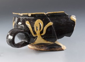 Though most of the artifacts in the New Street Tavern gallery were manufactured after the devastating 1692 earthquake at Port Royal, this is likely the oldest artifact showcased. The North Midlands or “Staffordshire” slipware cup was likely produced in the early eighteenth century and may have held cold or warm beverages at the tavern. The “light on dark” slip decoration may be attributed to Derbyshire.1 It features decoration reminiscent of “raised arm” foliage seen on similar examples of slipware that date to the same time period.