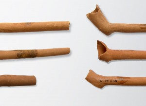 In addition to being a center of international commerce Port Royal was home to a local pipe-making industry. Hundreds of red clay pipes, made from local Jamaica clay, were found during excavations of New Street Tavern. Seventy-three percent of the red clay pipes from New Street came from levels believed to be contemporary with the earthquake.1 Although these pipes are thought to have been made to resemble European-manufactured pipes,2 there is no indication they were molded. Irregularities in their shape, lack of uniform thickness, and finishing techniques indicate they were likely handmade. Although the documentary record does not provide a lot of information on possible makers the 1711 inventory of James Hurst notes several “gross of Negro pipes” that Meyers 3 thought were crafted from the island’s red clay. John Taylor, an Englishmen who visited Port Royal in the late 1680s also noted that red clay pipes were made by “Negros.” 4 Moreover, while thousands of pipe fragments have been found at Port Royal red clay pipes have also been found at sites associated with enslaved individuals on other parts of the island, including Seville on the north coast. 5 Regardless of who was making them the variety of markings present on pipes in the assemblage—believed to be maker’s marks—suggests a large number of individuals were involved in their manufacture. The markings occur most often at the juncture of the bowl and stem that faces the smoker and consist of repeating small impressed stamps or lettering.