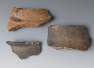 The top sherd is the rim of a large storage jar or vessel and the bottom two sherds are rims of smaller jars that were likely used for cooking. The paste of the top vessel indicates that it was likely fired in a controlled environment like a kiln, indicative of larger-scale manufacture, and also exhibits signs of being “thrown” on a potter’s wheel. The other two sherds may have been open-fired without the use of a kiln, a method indicative of smaller-scale, household production.