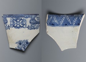Factories in England began producing their attempts at a facsimile of Chinese porcelain, known as “English soft paste,” as early as the 1740s and continued until the turn of the nineteenth century. The paste of the English version, often described as “chalky,” lacked the key ingredient in Chinese porcelain, kaolin. Much of the wares were transfer printed in an attempt to reduce cost and compete with hand-painted Chinese export porcelain sought after by consumers until refined earthenwares usurped their popularity. This mug fragment was printed with a variant of the popular pattern that would later be called “Willow” after 1810 and features a fig tree with a pagoda and other chinoiserie elements. It was likely produced around 1800.