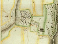 Excerpt from the 1755 plat of Jessups Estate. This excerpt show the main house and works complex on the right, the early slave village, Jessups I, in the center, and the 19th-century slave village, Jessups II, penciled in on the left.