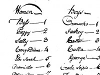 No women had occupations linked to their names but four carried names suggestive of their origins in Africa. These women included ‘Congo Diana’, ‘Ebo Sarah’, ‘Ebo Jenny’, and ‘Ebo Mary’. ‘Old Sarah’ and ‘Great Kate’ were listed last and were most likely the oldest enslaved women on the property. The 1748 list also provides clues to family groups. Priscilla, Ebo Sarah, Sabine and Judith each had a boy and Bess, Fanny, and Mary Ann each had one girl. Children’s names such as ‘Little Cuffee’, ‘Little Lucas’, and ‘Little Judith’ may also provide clues to parentage and family structure at Jessups Plantation.