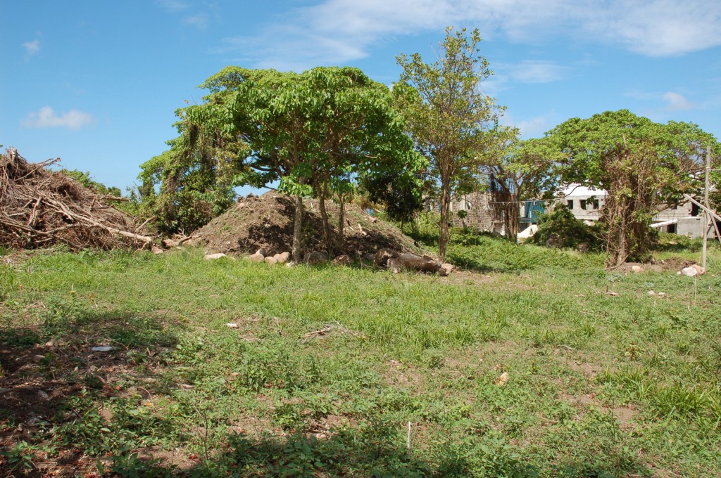 Close to this house were two slabs or waterholes and the ‘old cocoa garden’. Uphill were various fields given over to sugar cultivation, while further uphill were pasture fields, a provision ground, and forest. The provision ground was land set aside for slaves to grow their own food high up the hill side and was characterised by stone banks forming individual allotments; it is still in use today. Downhill of the great house and works were further sugar cane fields and also a second plantation centre, the Lower Plantation, shown on the map as a group of buildings with a cattle mill. This was possibly the Coles Point plantation purchased by Jesup in 1738. Combining archaeological survey with historical research has revealed a number of instances of smaller plantations being absorbed into larger ones, but in this instance the earlier buildings of the smaller plantation still remain to be located.