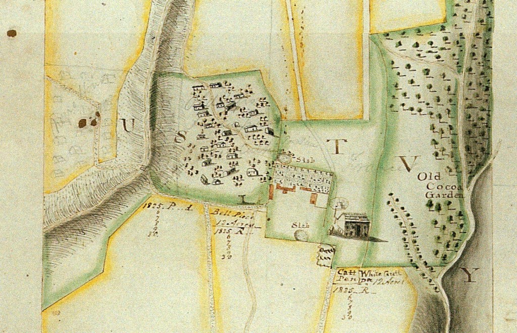 By 1734 the Abbot estate had passed to Phillip De Witt and Anne his wife. De Witt was probably Dutch, reminding us of the proximity of the Dutch island of St Eustatius to the north. By 1736, however, most of this estate was in the hands of Edward Jesup, a gentleman of St Christopher, who then purchased the estate from the De Witts with the exception of one small part on the seaward side known as Coles Point, which he purchased two years later. Our first view of the estate is a map surveyed in 1755 and commissioned by Jesup to show his landholdings on Nevis extending from the sea to the mountain, and showing in the center the estate’s great house and the adjacent slave village.