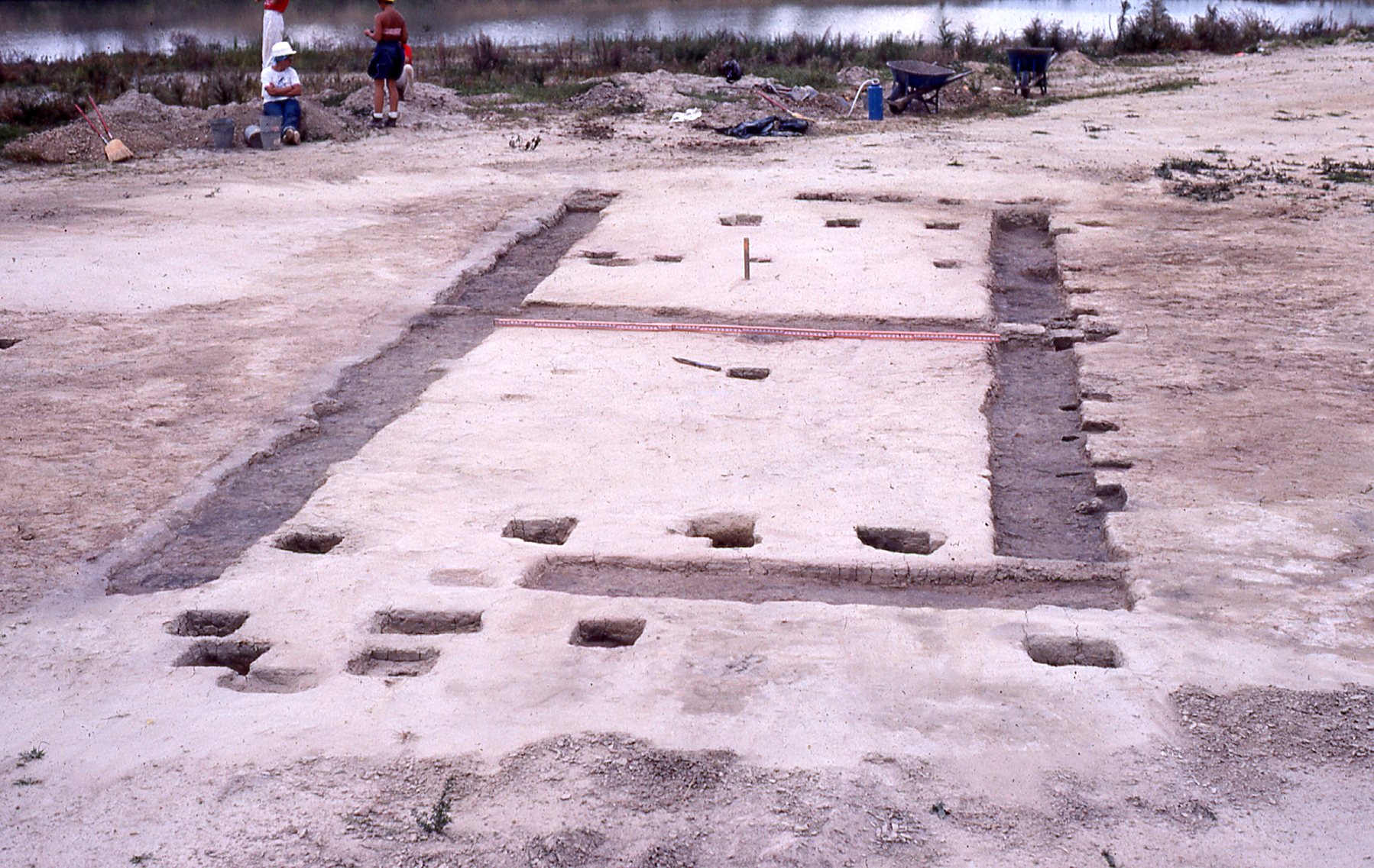 Structure G was a posthole structure located northwest of Structure B. The wide spacing of posts and the fact that the northeast and southwest ends had no intermediate postholes led to the conclusion it may have served a function such as a covered work area.