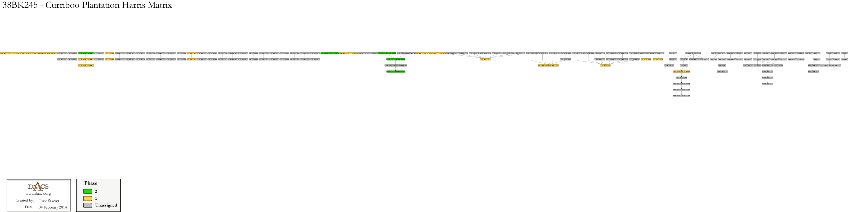See the Curriboo Chronology page for Stratigraphic and Phase information. Please note that some of the contexts present in the chronology analysis are not visualized on the Harris Matrix. The contexts that are not included do not have any stratigraphic relationships with other contexts. The lack of relationships can occur for a few reasons but two common examples are 1) the artifacts are from a surface collection, which is entered into DAACS as a context but does not have recorded relationships to other contexts that are below it ; 2) in cases where topsoil and plowzone are stripped and discarded, there may be features below the plowzone that are comprised of a single context. Since the plowzone does not exist as a documented context with artifacts, it cannot seal the single-context feature. DAACS also does not record subsoil as a context, so there is nothing for that single context feature to intrude or seal.
