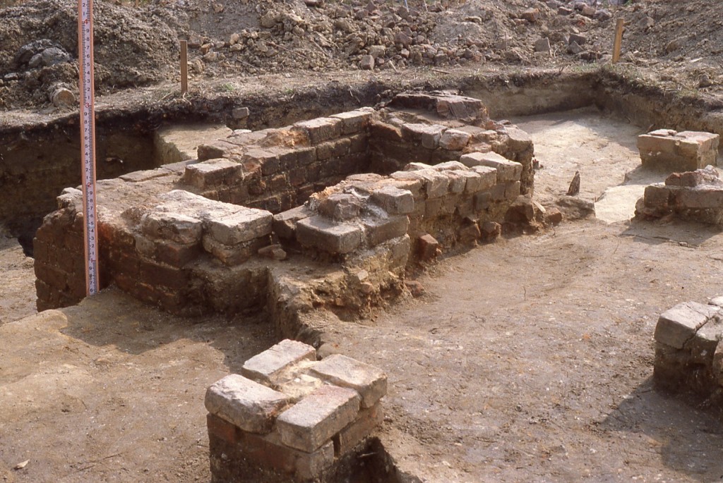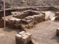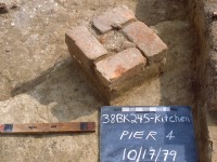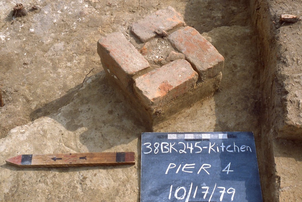 In addition to the block excavation at 245C, a brick clamp (245K) and a cellar (245A) were also hand excavated. The cellar was quartered first, then entirely excavated in natural layers to it’s sand floor. No remnants of an associated structure were found. Structure 245K, a brick clamp, had been severely impacted by construction and an attempt was made during mitigation to salvage what little remained of it. This was undertaken by trenching through its center in order to determine the deepest part of the intact feature, then dividing it into quadrants and hand excavating them.