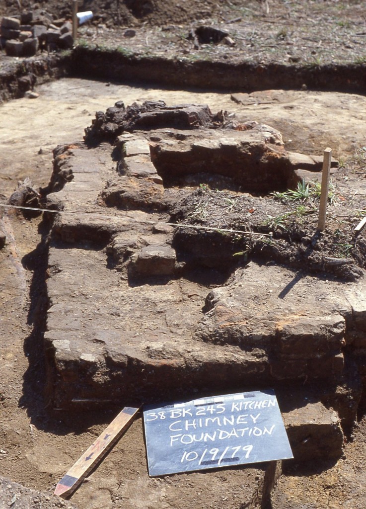 Structure 245A, was only represented by one feature, a cellar. Structure 245C was block excavated and discovered to be two structures: 245C1 and 245C2. 245C1 was built on brick piers and was the only structure with an indoor fireplace and brick chimney (Wheaton et. al. 102). It was built directly on top of 245C2, a trench structure with a cellar (Wheaton et. al. 190). Structure 245C1 likely served an administrative function, while the earlier 245C2 was interpreted by the Principal Investigators as serving a function related to the processing and housing of naval stores (Wheaton et. al. 191).