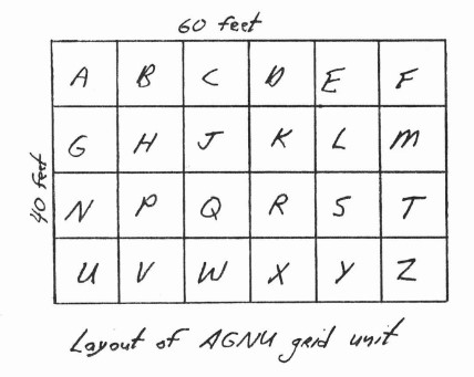 Hand drawn illustration of AGNU 40×60 foot grid block used in excavations of PG64, 65, and PG64/65. From Jane Townes’ Summary of Lab Procedures, Flowerdew Hundred Foundation Archives.