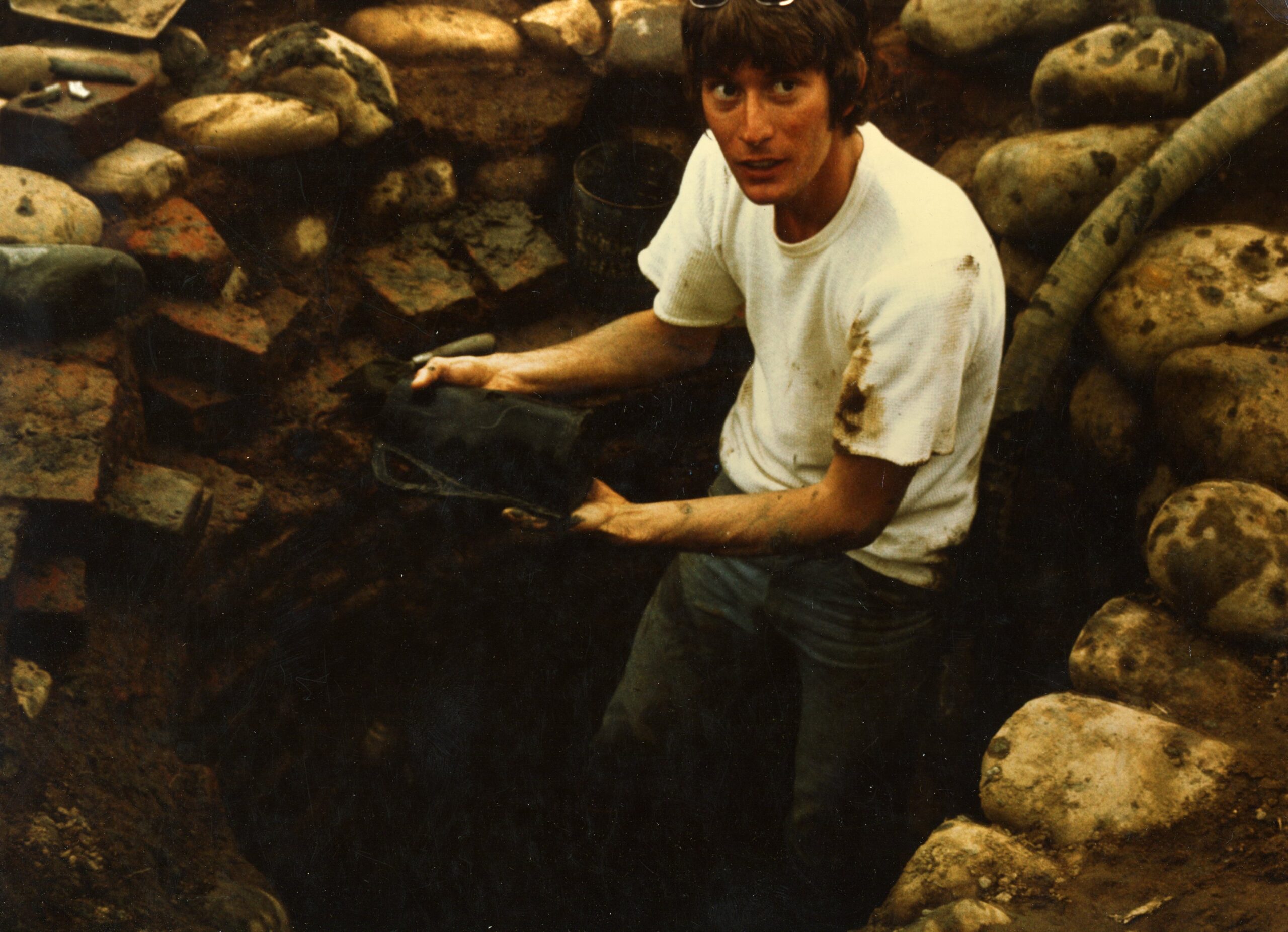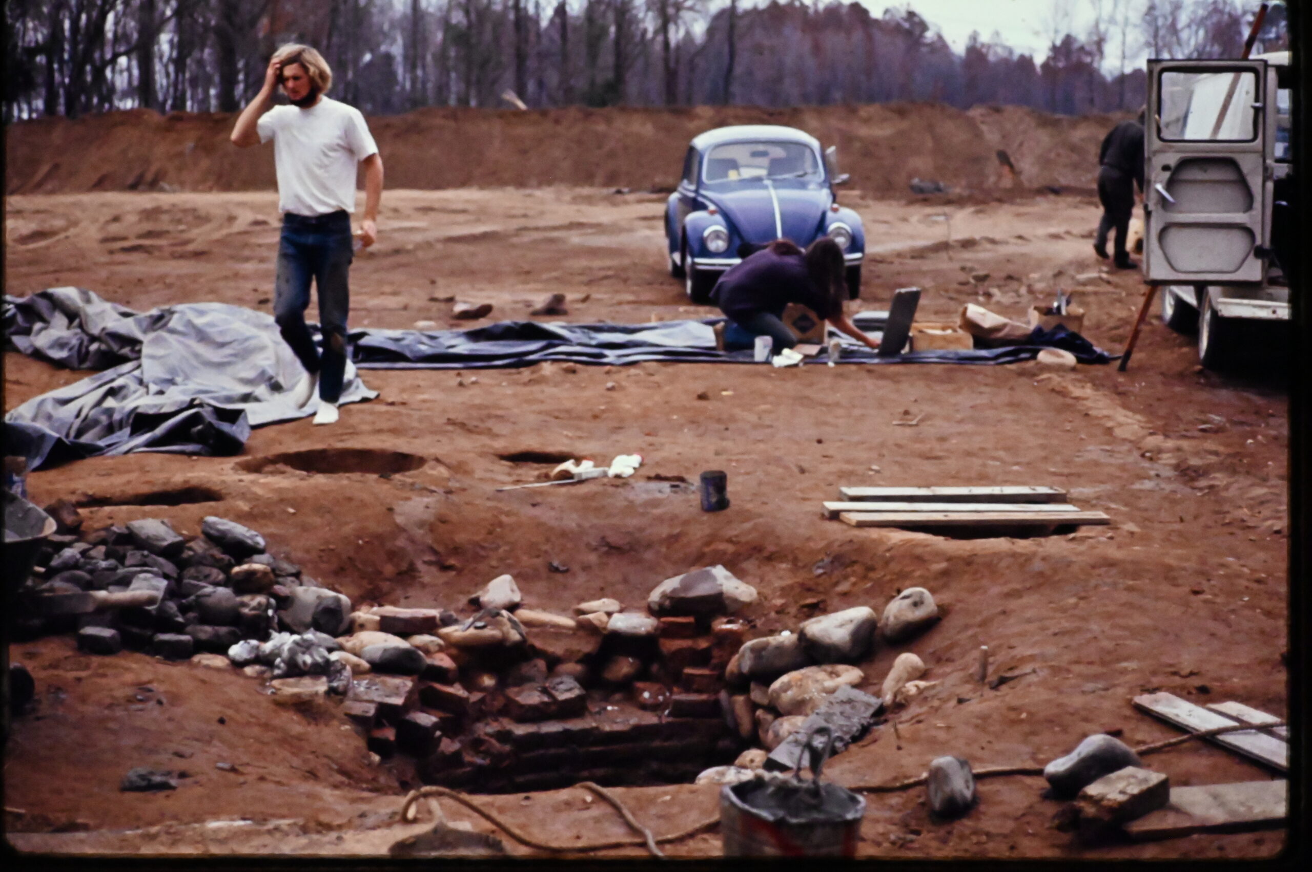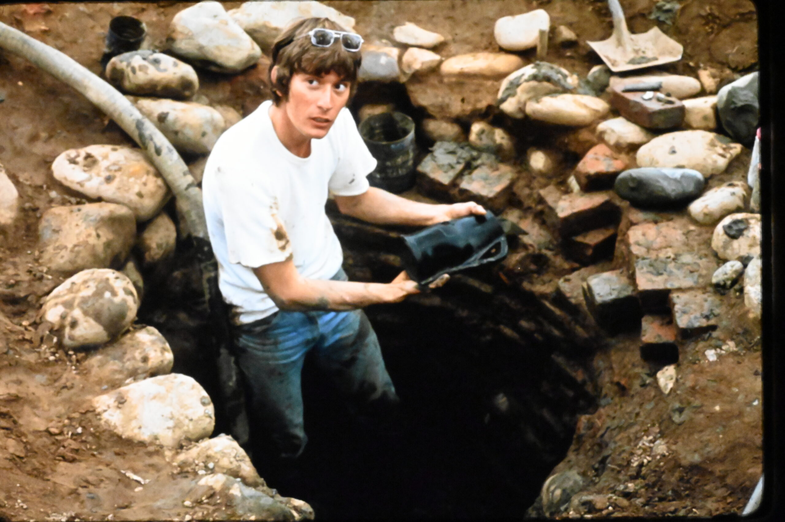 Well (F129), partially excavated, with crew member holding leather black jack found in fill deposit. Excavated by archaeologists with the College of William and Mary and Southside Historical Sites, Inc. Dated 1973. Excavated by archaeologists with the College of William and Mary and Southside Historical Sites, Inc. Dated 1973.