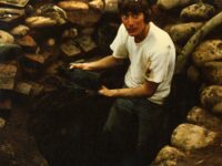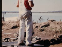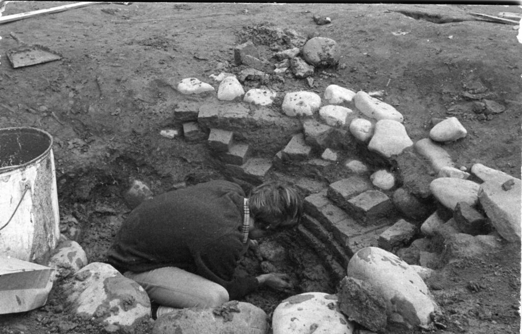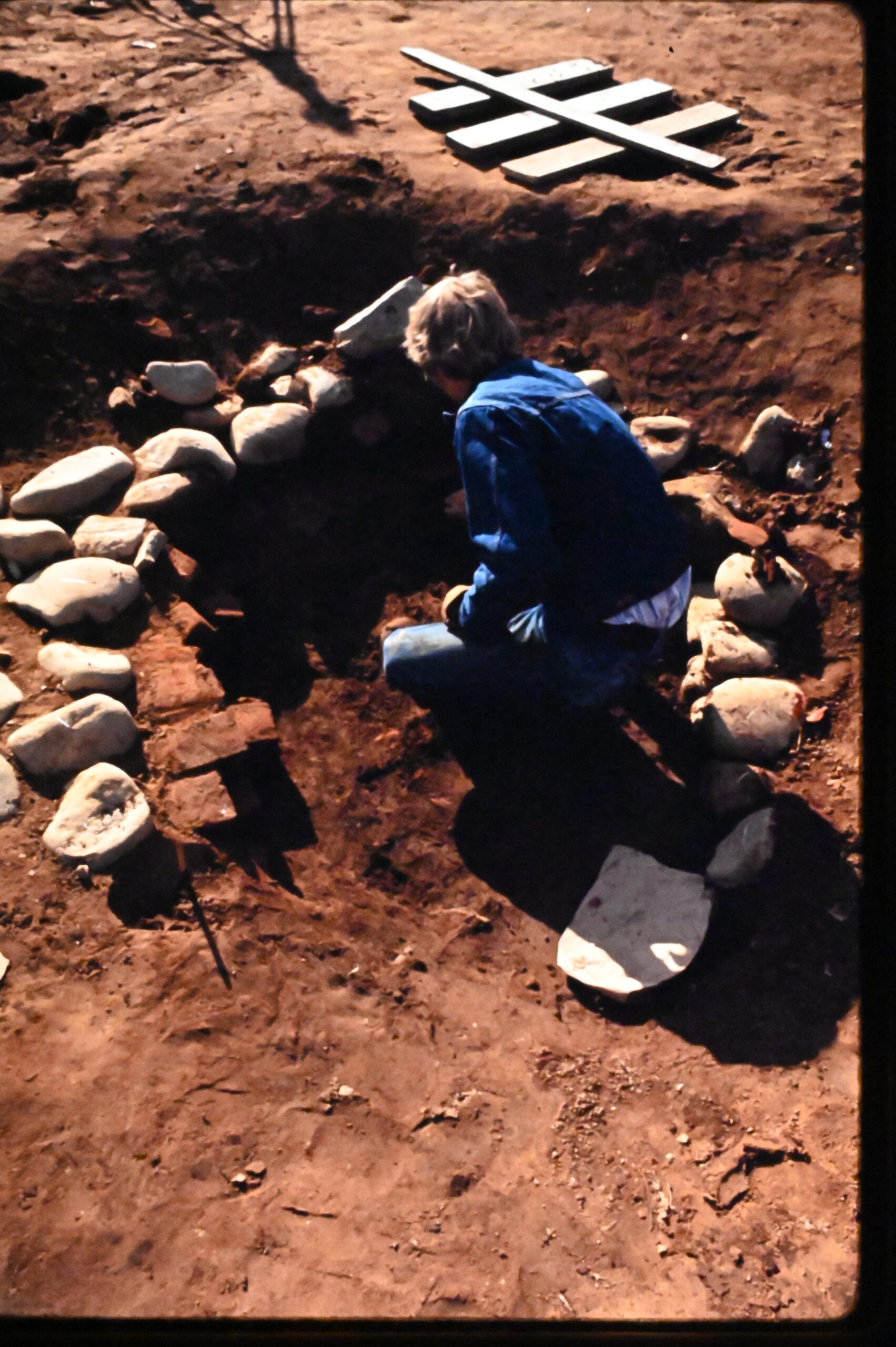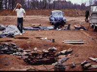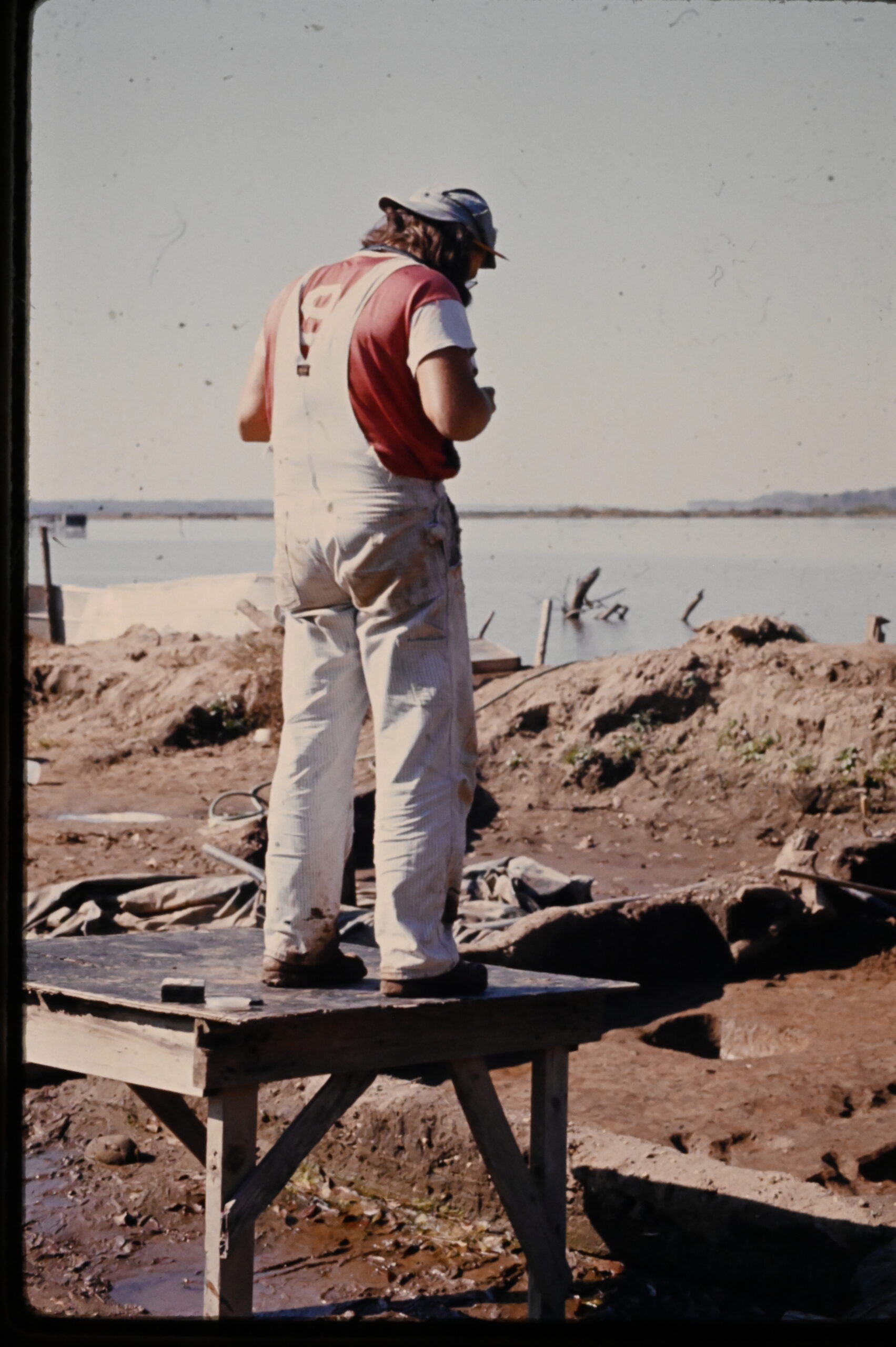 Well (F129), partially excavated, with crew member holding leather black jack found in fill deposit. Excavated by archaeologists with the College of William and Mary and Southside Historical Sites, Inc. Dated 1973. Excavated by archaeologists with the College of William and Mary and Southside Historical Sites, Inc. Dated 1973.