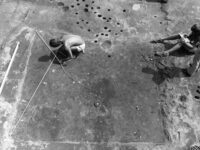 When PG3 was separated into three separate sites, excavators created a list of which 40-by-60 foot blocks should be assigned to each site. Vertical control was maintained by digging according to natural stratigraphy but at times arbitrary levels were also used within natural layers. Index numbers were assigned to each separate deposit or level designated by excavators. A combination of block number, quadrat letter, and index number was used as the provenience system for tracking artifacts. For example, artifacts labeled PG3/194A1 are from 44PG65, block 194 , quadrat A , and level index 1 (plowzone). Excavators recorded detailed information about each unit and level in the Level Book and captured plan views and profiles in drawn maps and photographic slides.