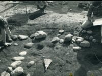 Excavators also uncovered hundreds of small circular shallow features that were interpreted as the remains of driven posts. While tracing the relationships among these various posts was difficult, excavators recognized the remains of two circular palisades associated with a Late-Woodland/Contact Period Native settlement (see Features page and Maps and Images).