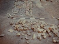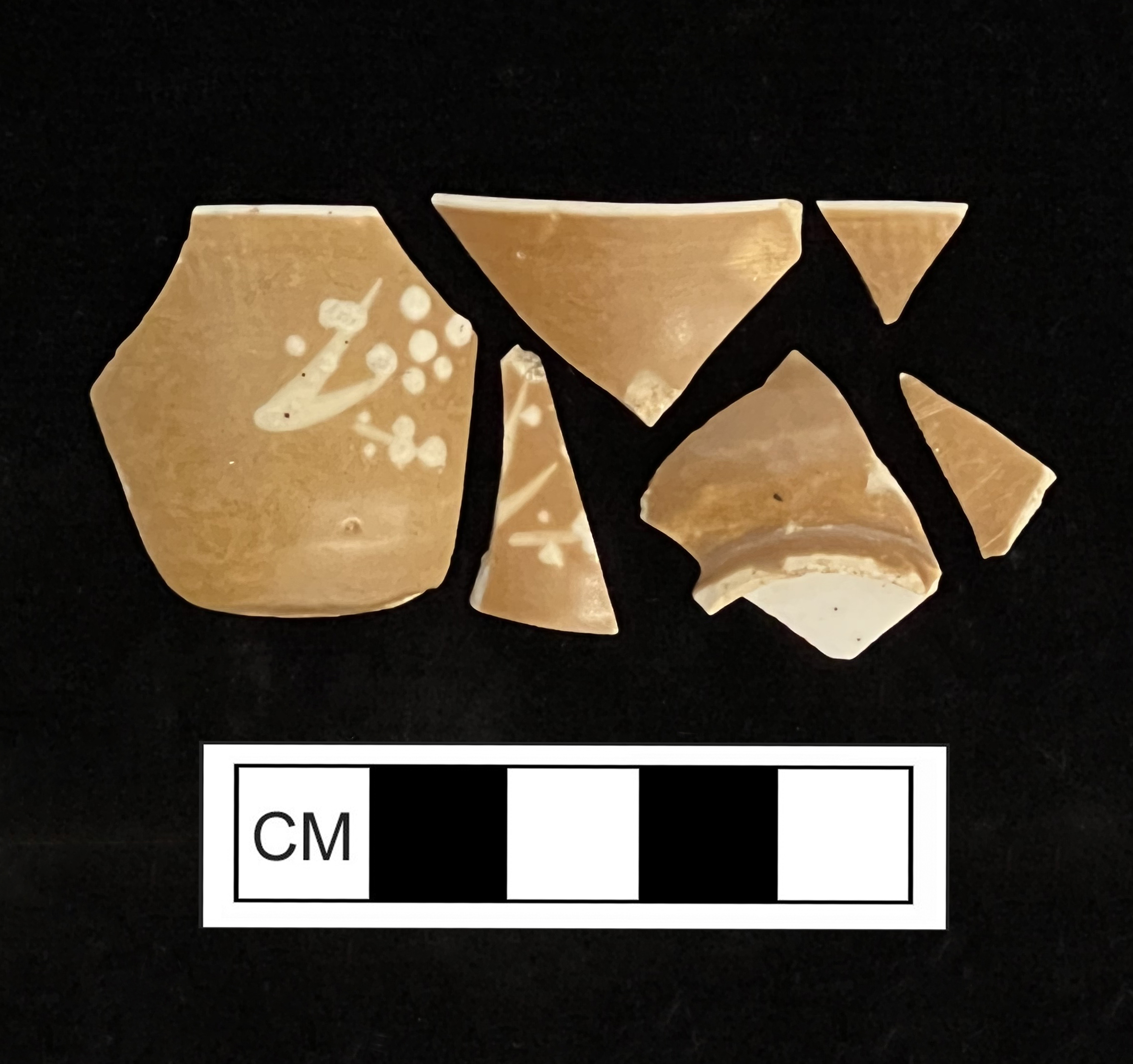 Chinese Porcelain wine cup fragments from PG65. The slipped decoration is a prunus branch, symbolizing the Daoist ideas of winter, longevity, beauty, and purity. The cup from was produced in Jingdezhen, a city in the Jiangzi province that is well-known for producing porcelain for export during the first decades of the 17th century.