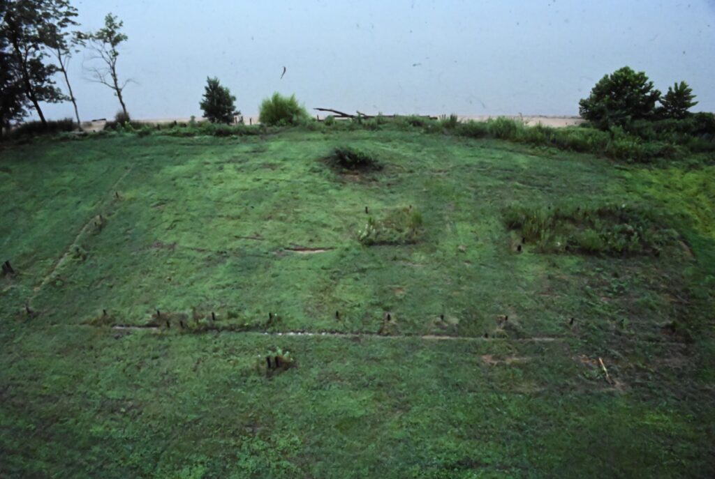 Detail of Palisade Trench, unexcavated, showing NE interior and exterior trenches in units 194P, Q, V, and W (facing north). Excavated by the College of William and Mary and Southside Historical Sites, Inc. Dated 1977.