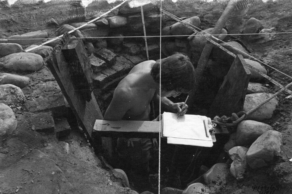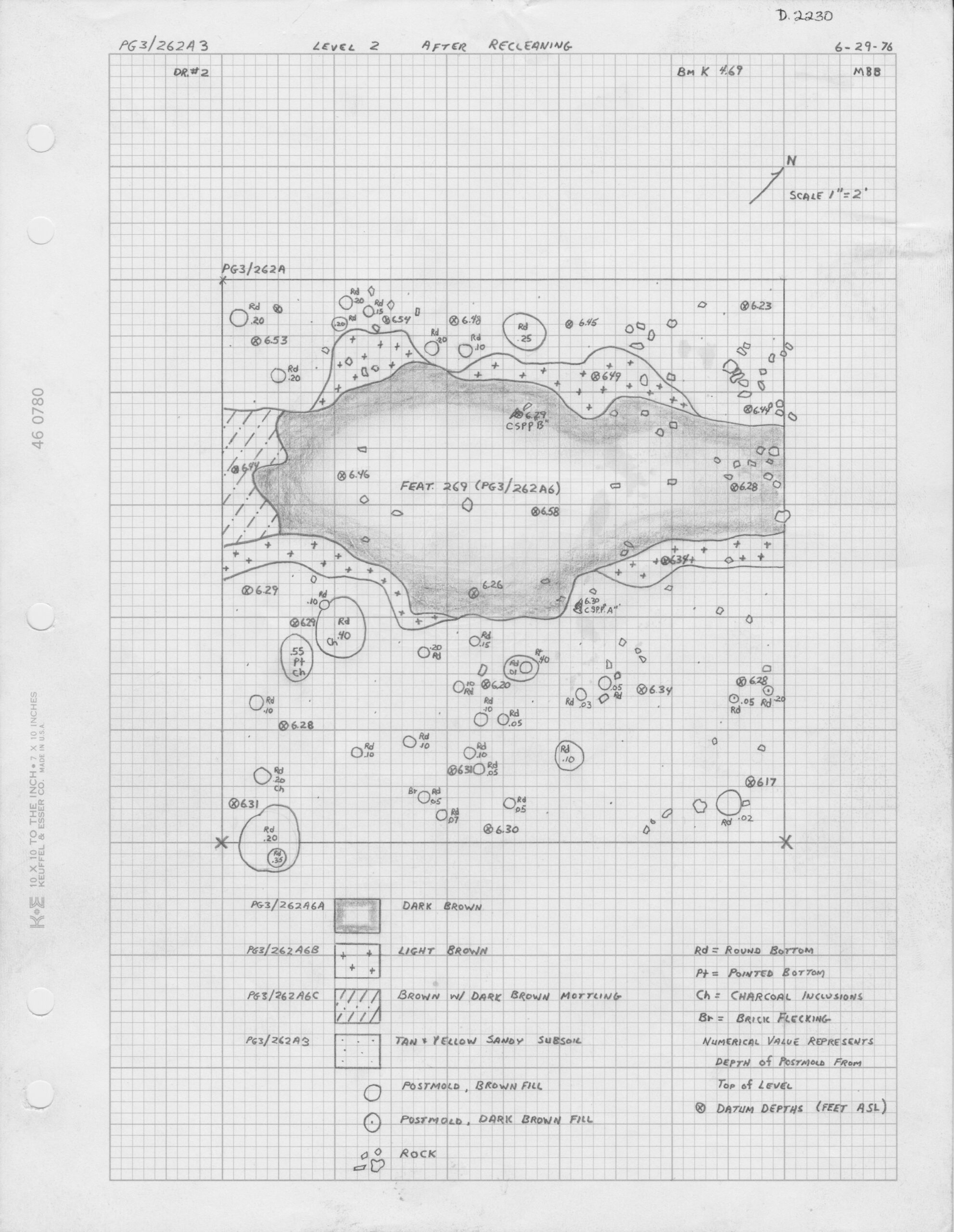 - The most intensive field seasons at PG65 were conducted from 1974–1978 by small crews of three to seven field archaeologists. While crews recorded deposit descriptions in the site level book and created detailed drawings for individual levels of each quadrat at times units sat open for over a year and were subject to periodic flooding. Consequently, when crews returned to the unit it was difficult to reconstruct what previous excavators had recorded. These instances are recorded in the Excavator Description field. DAACS staff members had to use their best judgement when assigning stratigraphic relationships to the various deposits in units subject to these complications.