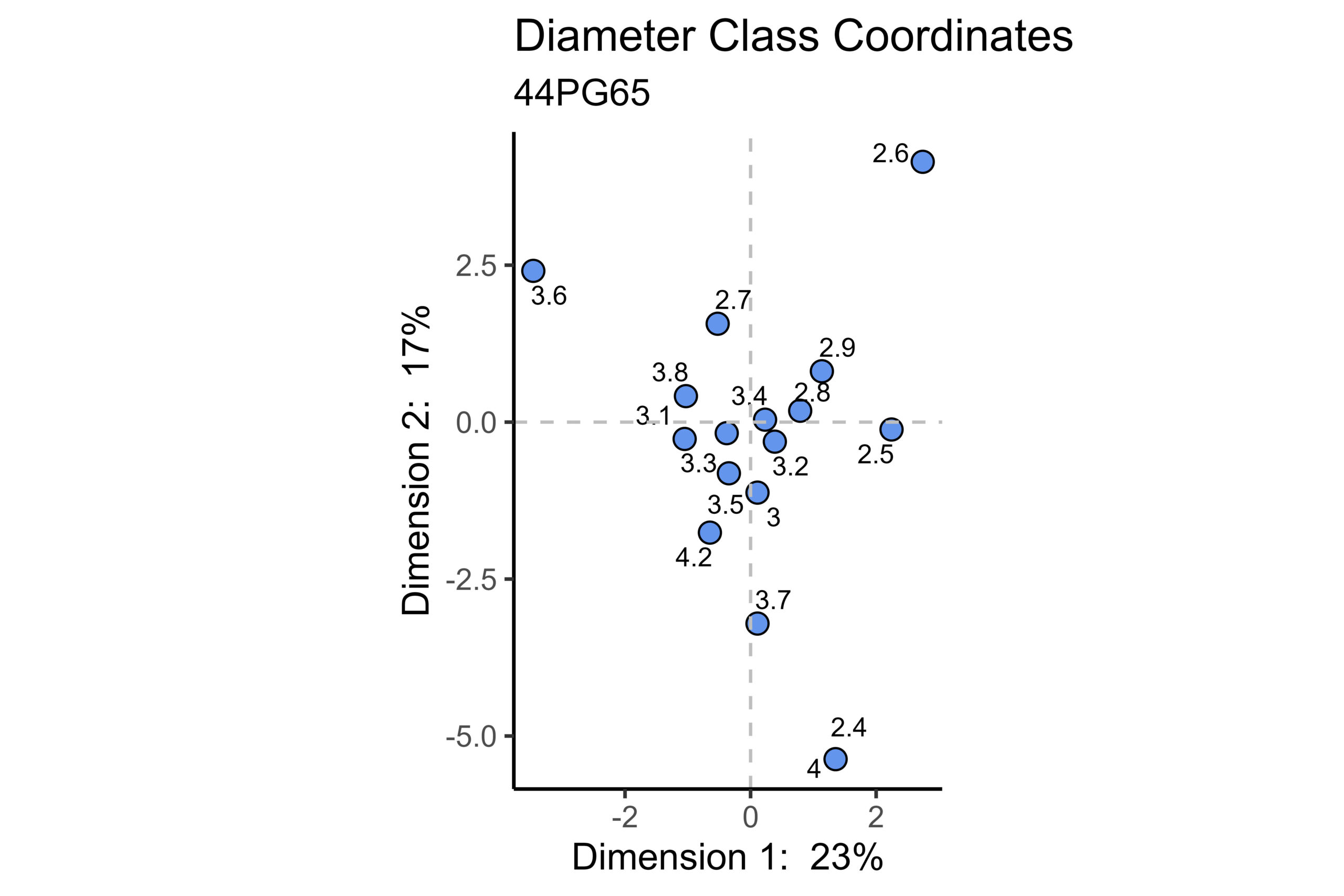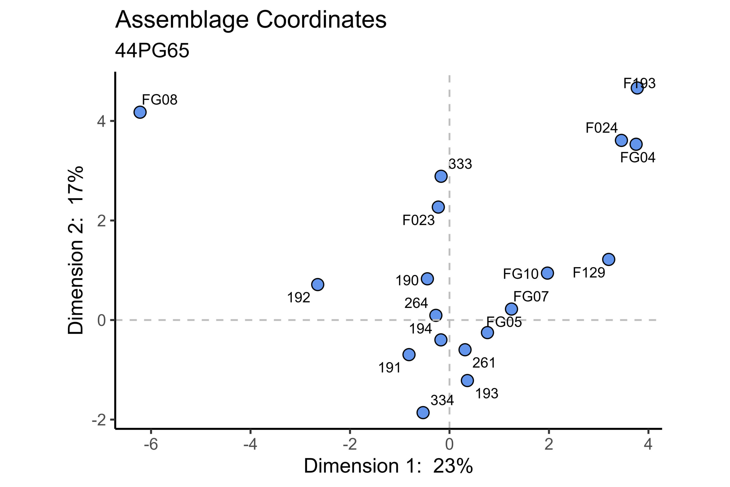 A plot of the assemblage scores on the first two CA dimensions offers a picture of similarity among them based on the diameter-class frequencies (Figure 1). The expectation is that the scores along Dimension 1 correlate with time.