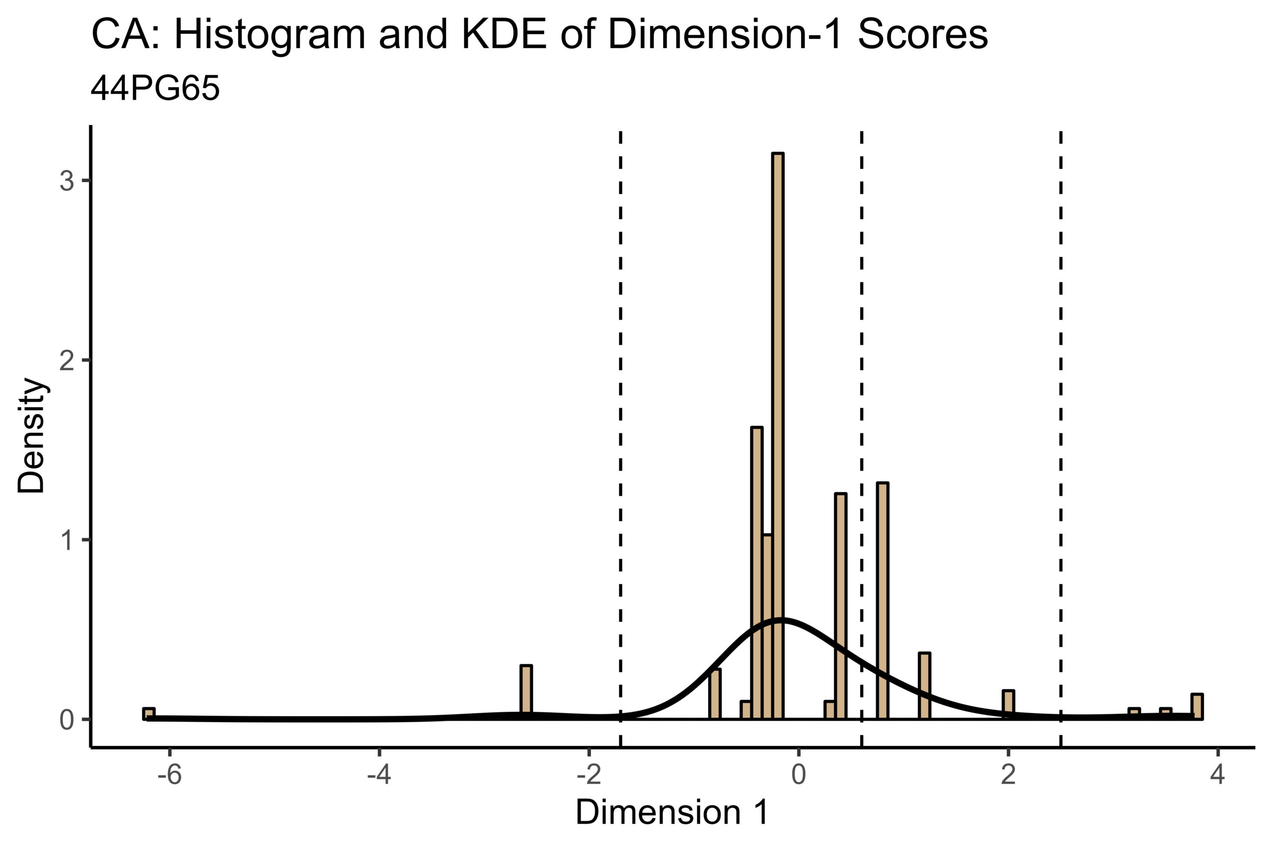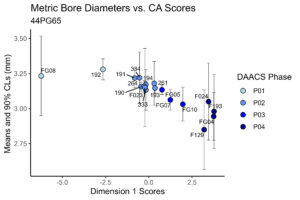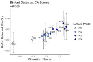 To further test our results, we plotted the Dimenson-1 scores from the second CA against the metric means and their confidence intervals (Figure 4). We see the positive correlation expected if Dimension-1 scores capture time.
