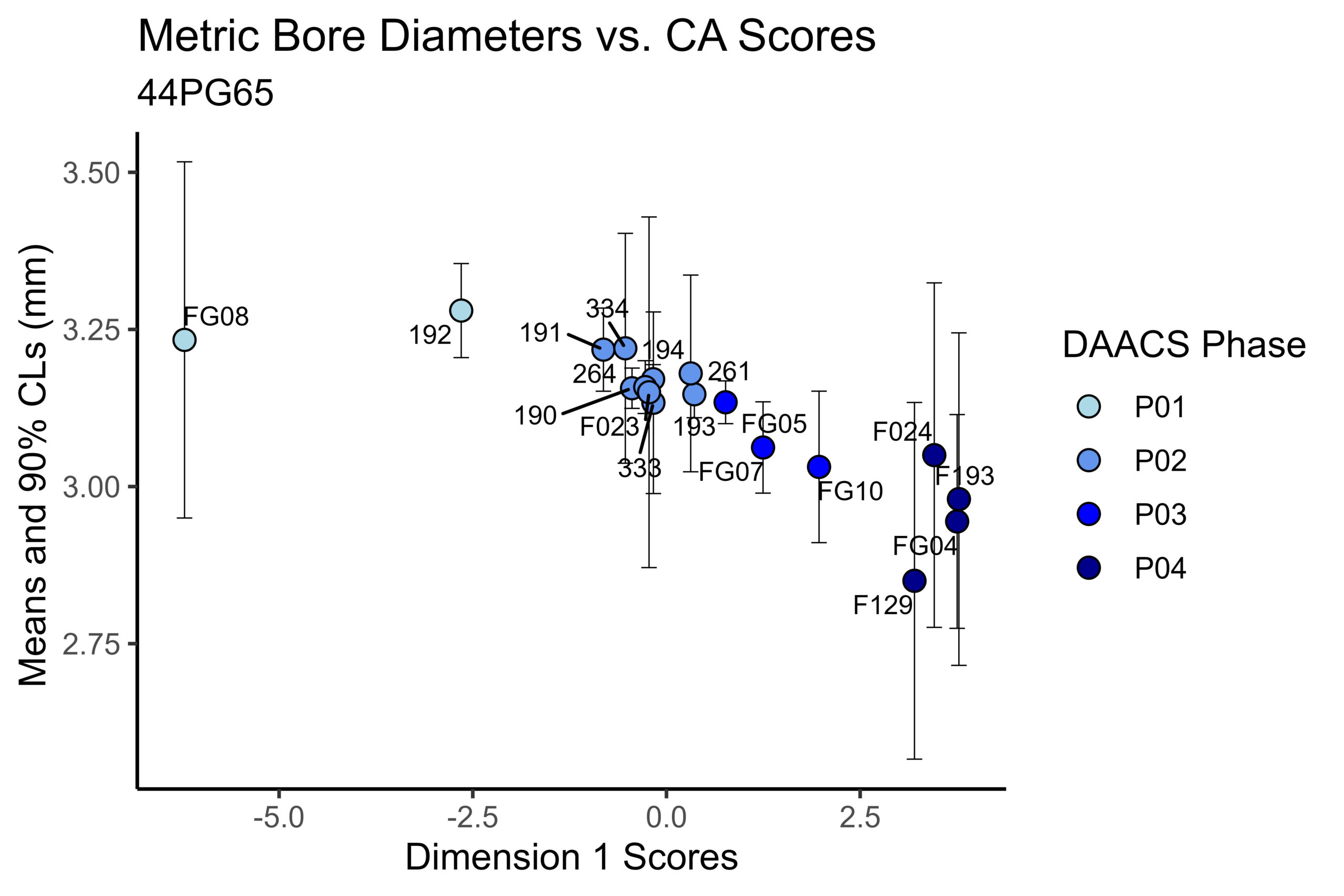 Figure 5. CA Dimension 1 scores for assemblages plotted against Binford dates for bore-diameter means and their 90% confidence intervals, based on 1/64th-inch measurements.