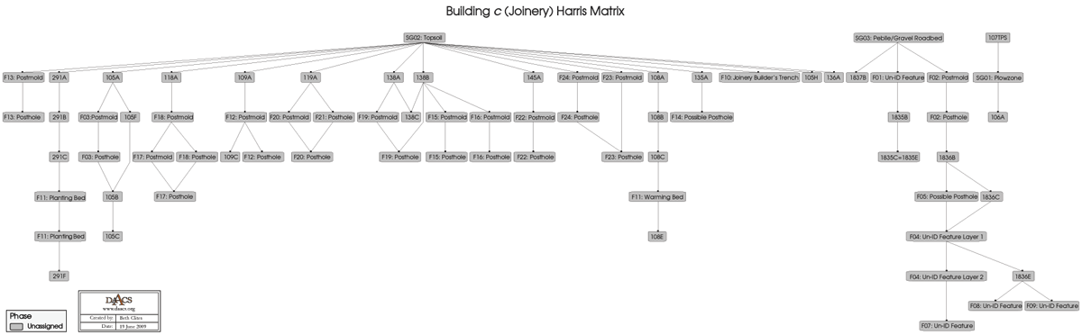 This Harris Matrix is based on data on stratigraphic relationships recorded among contexts in the DAACS database. It was drawn with the ArchEd application. See http://www.ads.tuwien.ac.at/arched/index.html.