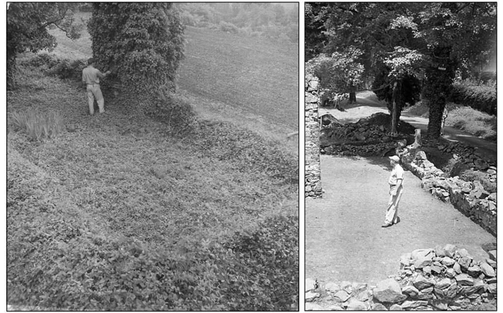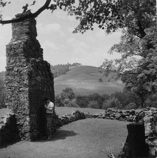 Joinery foundation and chimney after excavation by Oriol Pi-Sunyer, c.1957. Montalto is visible in the distance.