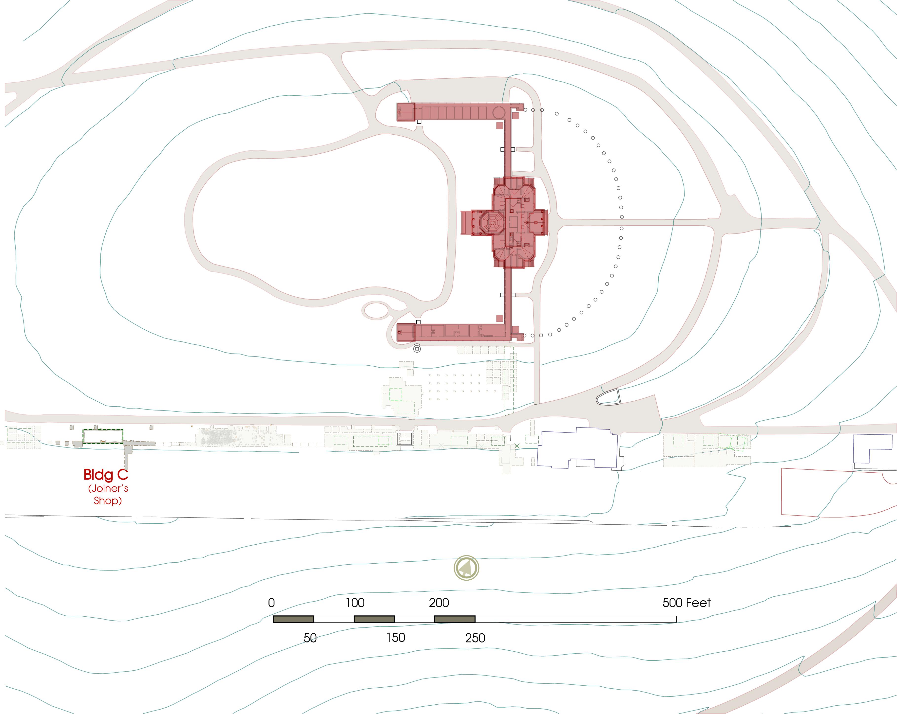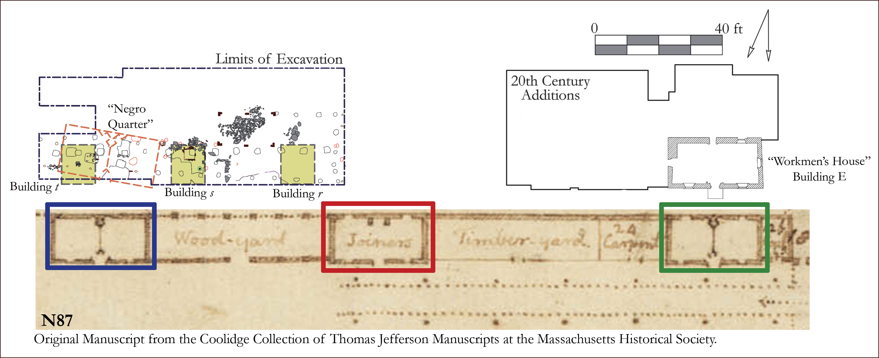 Excerpt from early plan drawing of Mulberry Row, c.1776-1778 (Jefferson: N87) aligned with map of excavations. The Joinery is outlined in red between the