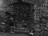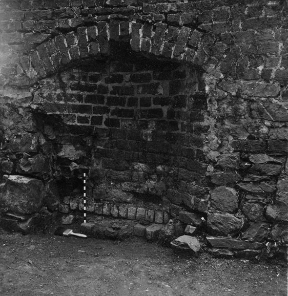 After exposing the Joinery substructure completely, Pi-Sunyer conducted a detailed architectural analysis. The foundation measured 18-by-51 feet, with walls consisting of “unfaced, or at the best crudely faced, stone coursed with little to no mortar” (Pi-Sunyer 1957: 8) and averaging about two feet in thickness. Only at the corners and near the chimney did Pi-Sunyer document the presence of mortar and faced stones. Inside the building he uncovered a concentration of flat stones centered on the north wall, which he interpreted as an entrance, an intact stone and brick firebox and chimney opposite, and a floor of packed clay. The chimney, still standing today, had a brick-lined firebox and included four cement-lined cavities that most likely supported wooden beams. Part of the south wall showed evidence of two periods of construction or repair (Pi-Sunyer 1957: 7-10). Given the location, dimensions, and other architectural features of the Joinery foundation, Pi-Sunyer identified this structure as the Joinery (Building c) recorded by Jefferson on the 1796 Mutual Assurance Plat (Pi-Sunyer 1957: 26). Finally, Pi-Sunyer described the artifacts he discovered as being few in number and non-diagnostic for the exact function of the building.