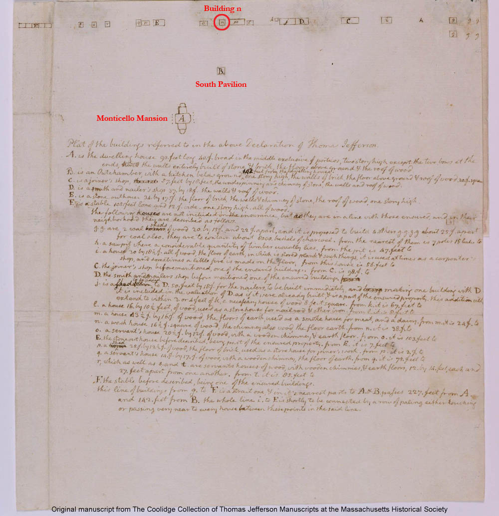 While the construction date of Building n is unknown, the earliest known documentation of the structure is found in Jefferson’s 1796 Mutual Assurance Declaration (Jefferson: N133), where he described it as: