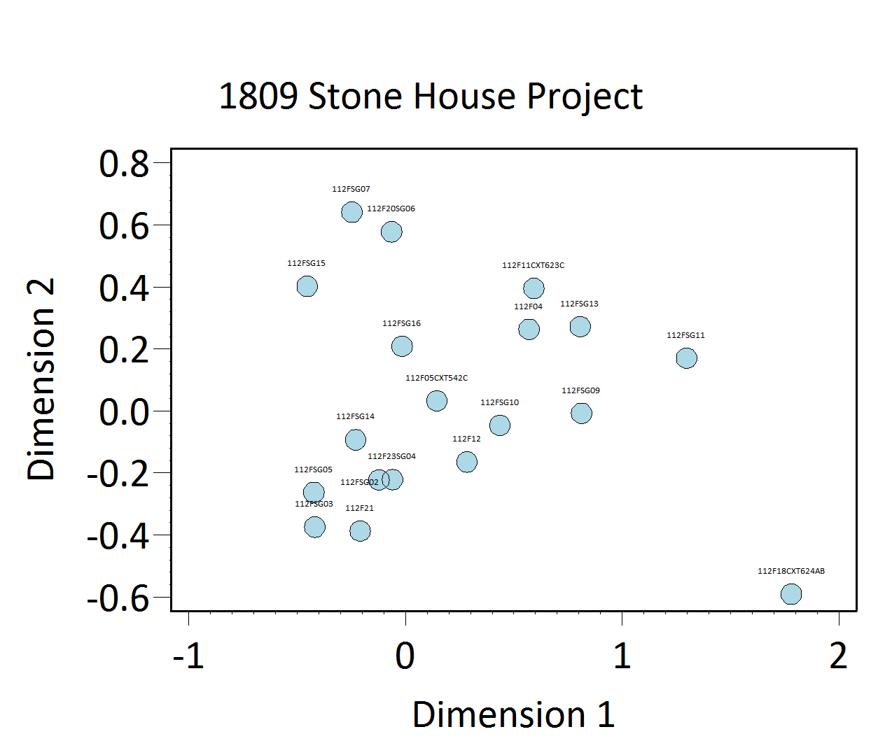 As with other sites in the Archive, the seriation chronology for the 1809 Stone House project was derived from ceramic assemblages aggregated at the level of contexts and stratigraphic groups, and not at the level of features. This is because most contexts and stratigraphic groups on the site were not parts of features. For the relatively few cases where seriated contexts and stratigraphic groups were parts of features, the relevant feature numbers and descriptions are included in the seriation chronology table below. A seriation using MCD-types did not produce a successful chronology for the site. Thus, the seriation chronology presented here is the result of a correspondence analysis of ware-type frequencies in each stratigraphic group and each individual context that had no stratigraphic group assignment (Figures 1 and 2). Not all contexts have stratigraphic group assignments.