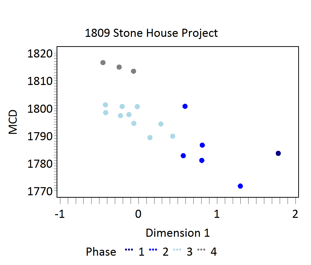 To reduce the noise introduced by sampling error, only ceramic assemblages with more than 5 sherds and more than two ceramic type from individuals excavated contexts and from stratigraphic groups were included. The results produced a strong correlation between Dimension 1 scores and MCDs (Figure 3). The correlation is even stronger for Dimension 1 scores and BLUE MCDs, which weights ware types with shorter manufacturing spans (Figure 4) (see Neiman and Smith 2005 for details). Based on the dips in ceramic counts observed in a histogram of Dimension 1, we divided the site into three phases (Figure 5). An additional phase (P04) was created from a group of three SGs set apart along Dimensions 1 and 2. Phase four assemblages appear to be mixed deposits with both early and late material.