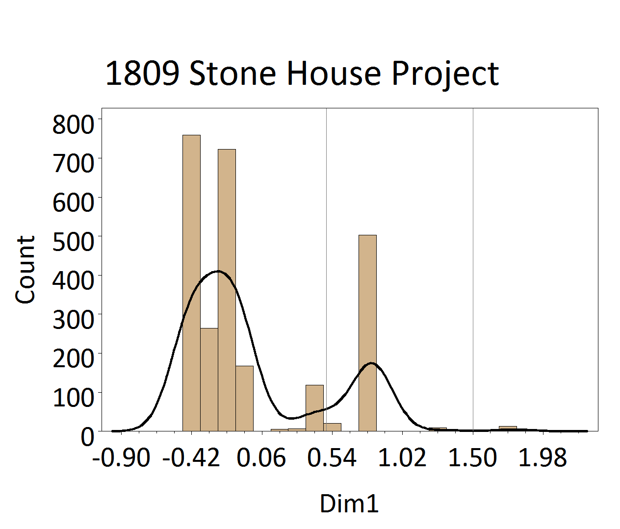 Figure 5. Histogram of ceramic counts plotted along CA Dimension 1. The lines indicate DAACS phase divisions.