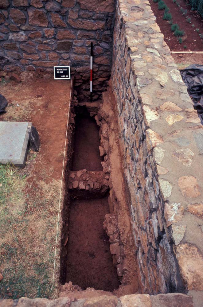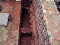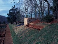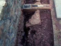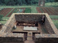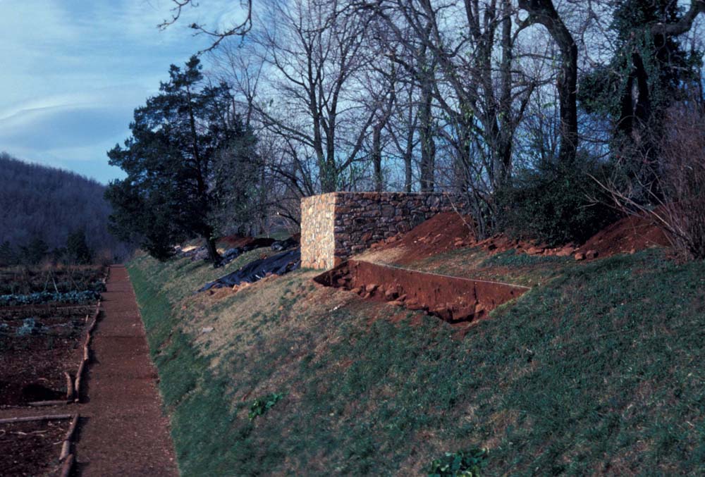 William Kelso directed the majority of excavations at the 1809 Stone House. In 1979, he opened two excavation units to the southeast of the structure as part of a larger project to identify fence lines that separated the buildings on Mulberry Row from the terraced garden to the south. These units measured 10-by-4 feet each, one of them intercepting the end of the trench Pi-Sunyer dug along the eastern wall. In 1980, a single 14.75-by-3.0 foot unit was excavated along the interior west wall of the structure to look for a Jefferson-period garden entrance thought to be in the area. This was the same spot where a trench was dug in the 1970s to repair the stone foundation and install a concrete footing.