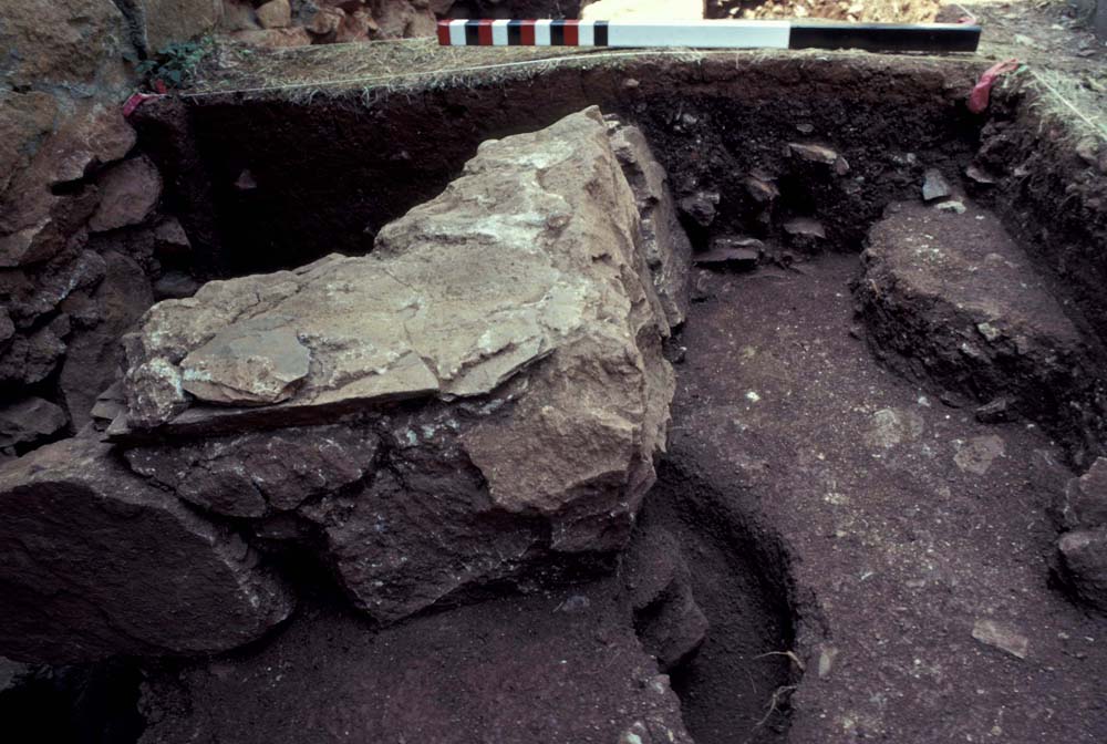 1982 excavations showing the stone concentration marking MRS-5 on the camera side of the 1809 Stone House (background).