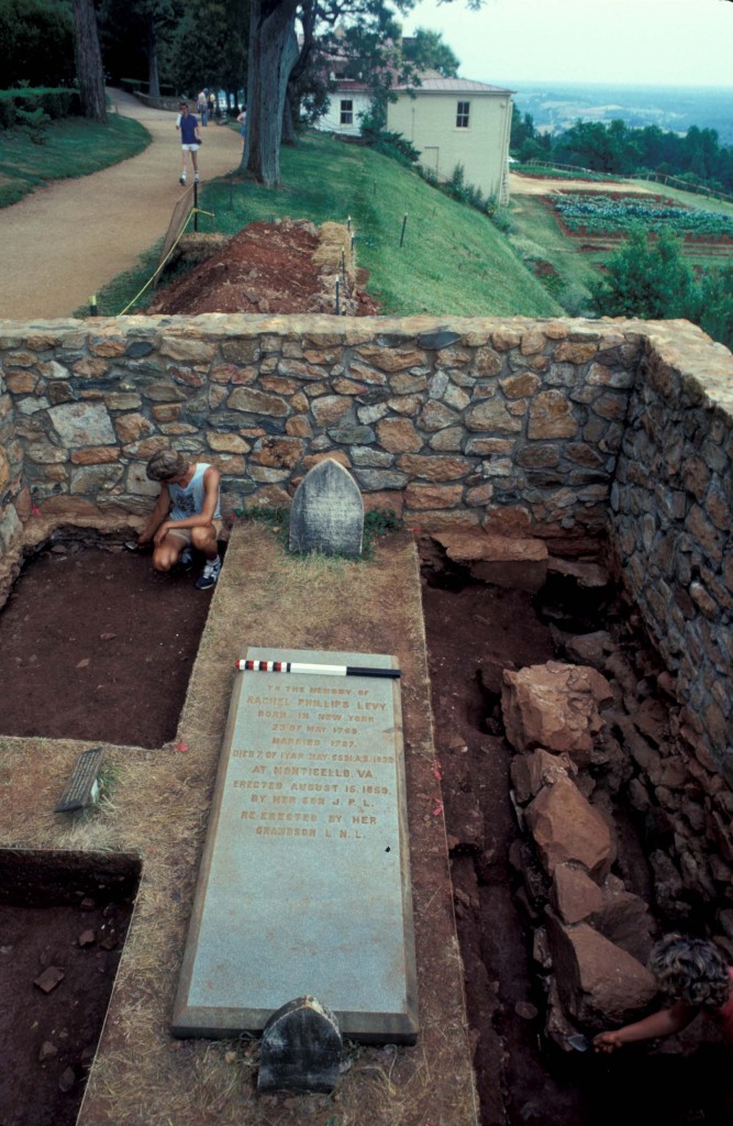 The 1809 Stone House site is named for a masonry dwelling that documents reveal was completed in 1809. It succeeded an earlier log structure which Jefferson identified as Building n, a washhouse, on the 1796 Mutual Assurance plat. Following the sale of Monticello after Jefferson’s death, the new owner, Uriah P. Levy, used the Stone House as a burial site for his mother in 1839. To this day, the tomb and headstone of Rachel Levy remain at this location (Urofsky 2001:197). The grave marker serves as the major visible reminder of the family that owned Monticello for nine decades (Urofsky 2001:193).