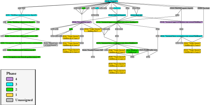 The stratigraphic relationships among stratigraphic groups and unassigned contexts are summarized in the Harris Matrix for the site. Phase assignments from the seriation are shown on the Harris Matrix in color, facilitating comparison of the seriation chronology and the stratigraphic chronology of the site.